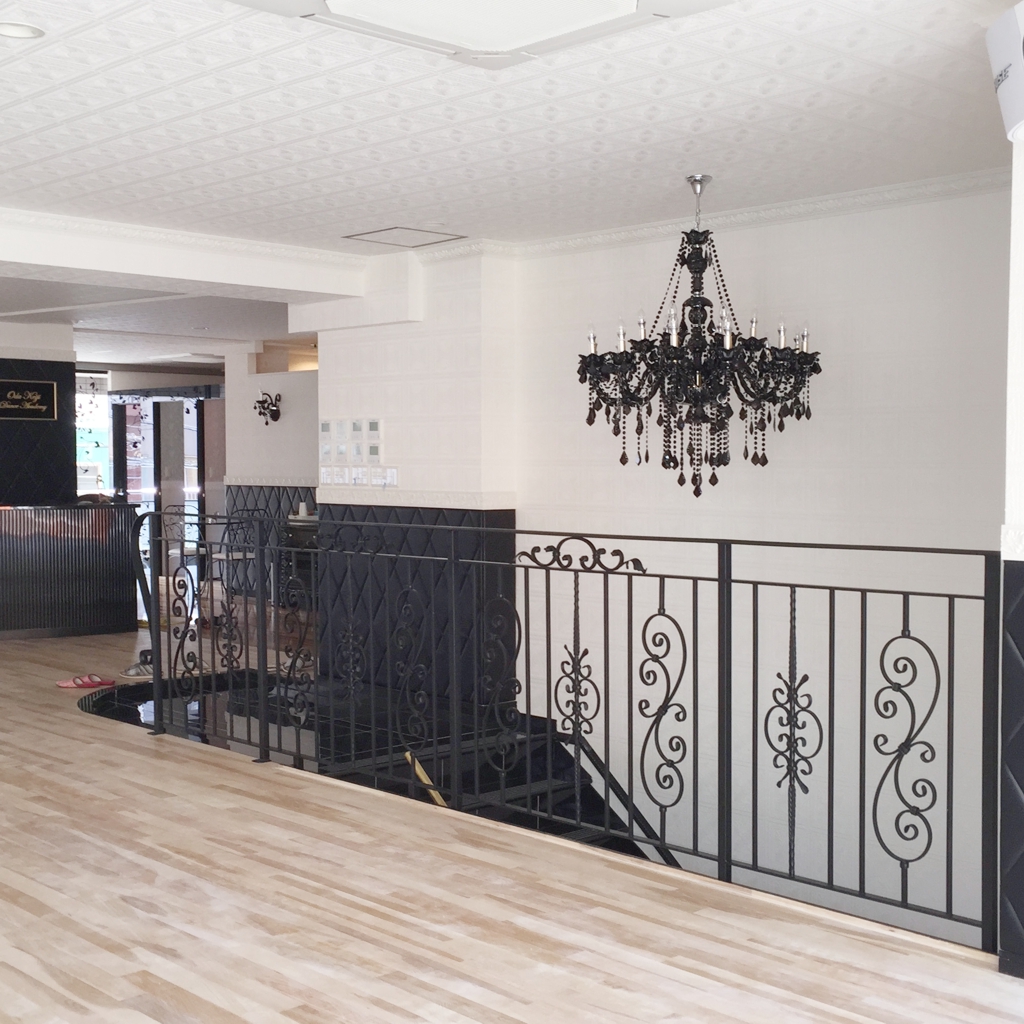 概要:スタジオのフロアと階段の境に設置した手摺です。手摺の向こうの階段上の空間がスタジオの一部に見えるので広々した印象になりました。
