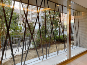 概要:ロビー窓の外側に長尺材をタスキ掛けに組んだスクリーンを取付けました。大きいので3分割で輸送し現場で組み立てました。