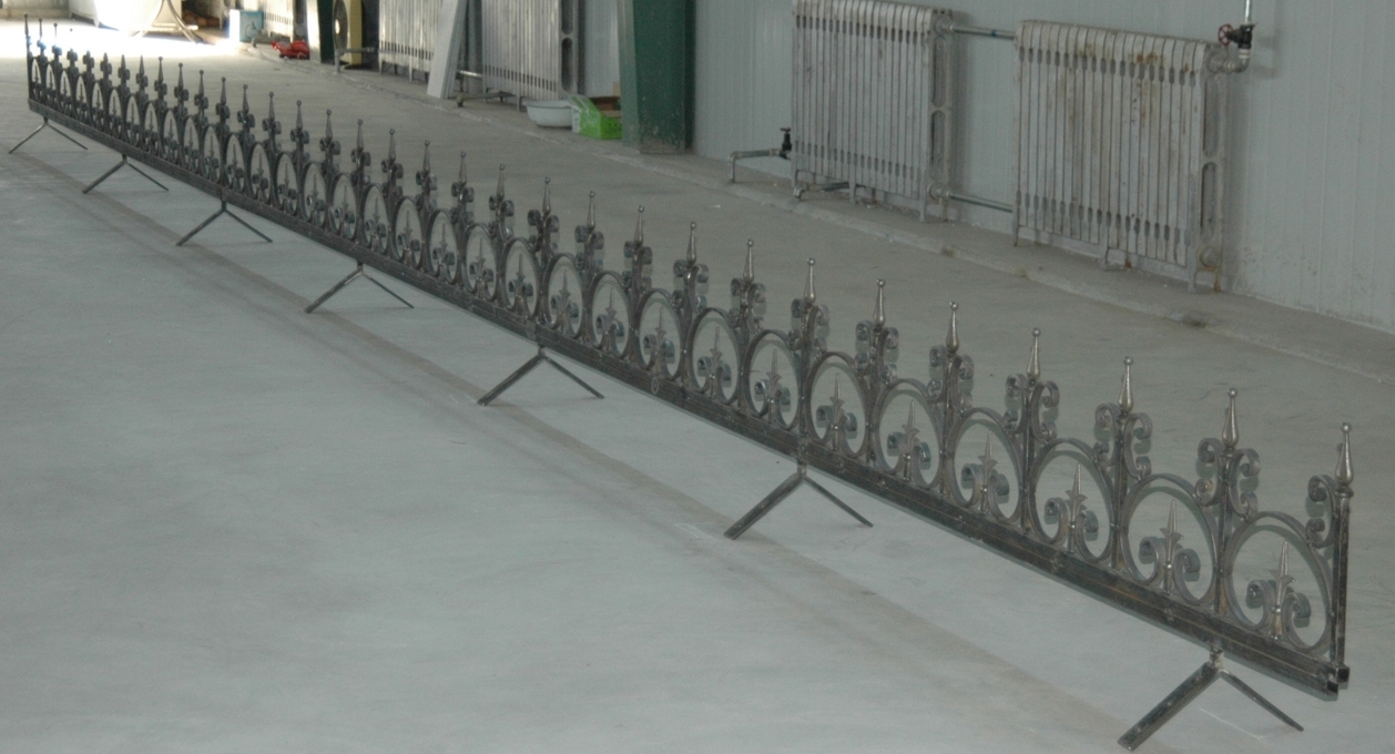 概要:クリニックの外装、外構用ロートアイアンです。屋根の上の飾りはヨーロッパの古い建物によく見かけるアイテムで、こちらの建物でも大変目立ちます。外構のアーチ、フェンスは簡素な作りになりました。