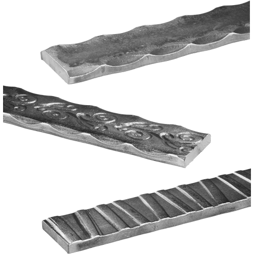 長尺素材(フラットバー) 2コーナー槌目模様フラットバー 000.30.243 価格(税別):¥3,380在庫:標準製作技法・材質:ロール加工断面:20X8mm...