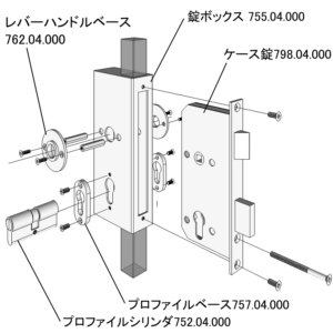 ● ケース錠・フファイルシリンダー・レバーハンドルや座金を組付ける時は、すべてのパーツを緩めにネジ止めした後、作動を確認しながら順次締付け固定してください。